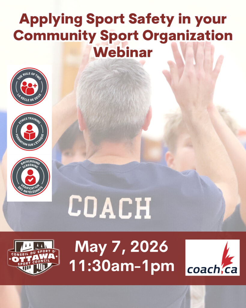 Learn how to take action and Apply Sport Safety in your Community Sport Organization with a webinar from the Coaching Association of Canada and the Ottawa Sport Council on Thursday, May 7 from 11:30 a.m. to 1 p.m.