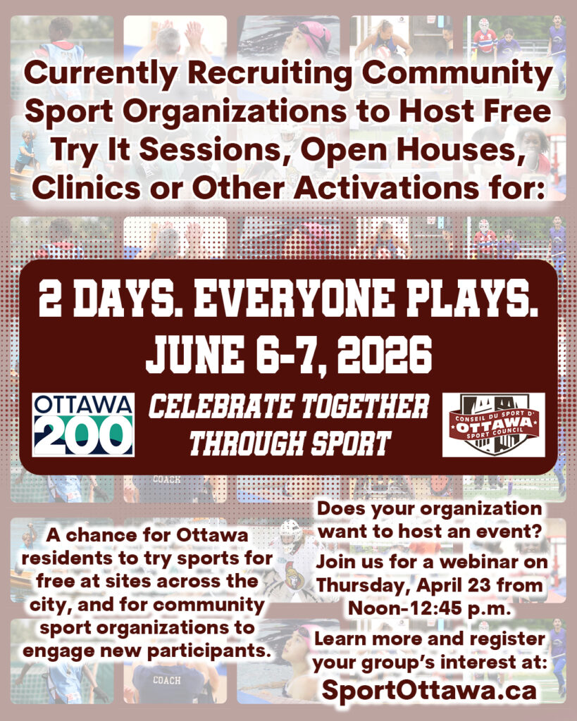 The Ottawa Sport Council is currently recruiting community sport organizations interested in hosting free try it sessions, open houses, clinics or other activations for “2 Days. Everyone Plays.” on June 6-7. This massive citywide initiative will allow Ottawa residents to Celebrate Together Through Sport as we mark the 200th anniversary of our city’s establishment.