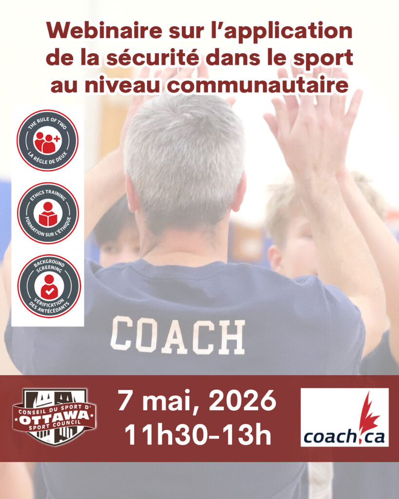 En partenariat avec l’Association canadienne des entraîneurs, le Conseil du sport d’Ottawa organisera un webinaire le jeudi 7 mai, de 11 h 30 à 13 h, sur la manière de mettre en œuvre le programme de sport sécuritaire au sein de votre organisation sportive communautaire.
